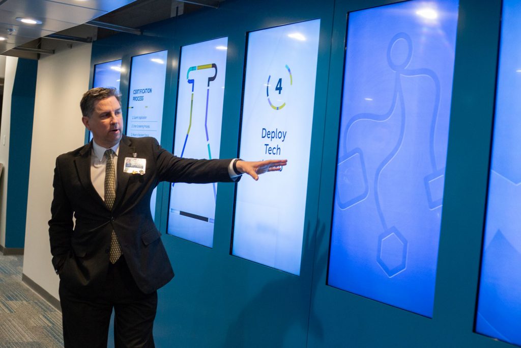 Lancaster General Health Director of Public Relations and Corporate Communications John Lines takes a look at the 8-panel video wall in the Smart Health Innovation Lab lobby.